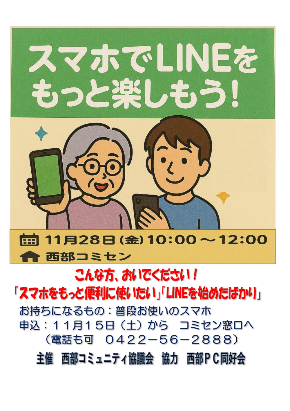 西部コミュニティセンター、略して「西部コミセン」。コミセンは武蔵野市民みんなの施設、どなたでも使うことができます。地域でコミュニティ活動する場所、情報を発信する場所、人と人がつながる場所です。いろんな機能を持った部屋があります。しかも、なんとコミセンの使用料は無料なんです。ときどき、お祭りなどのイベントも開催しています。運営に参加することもできます。